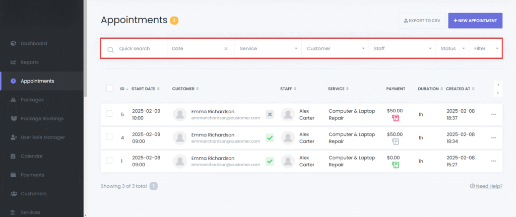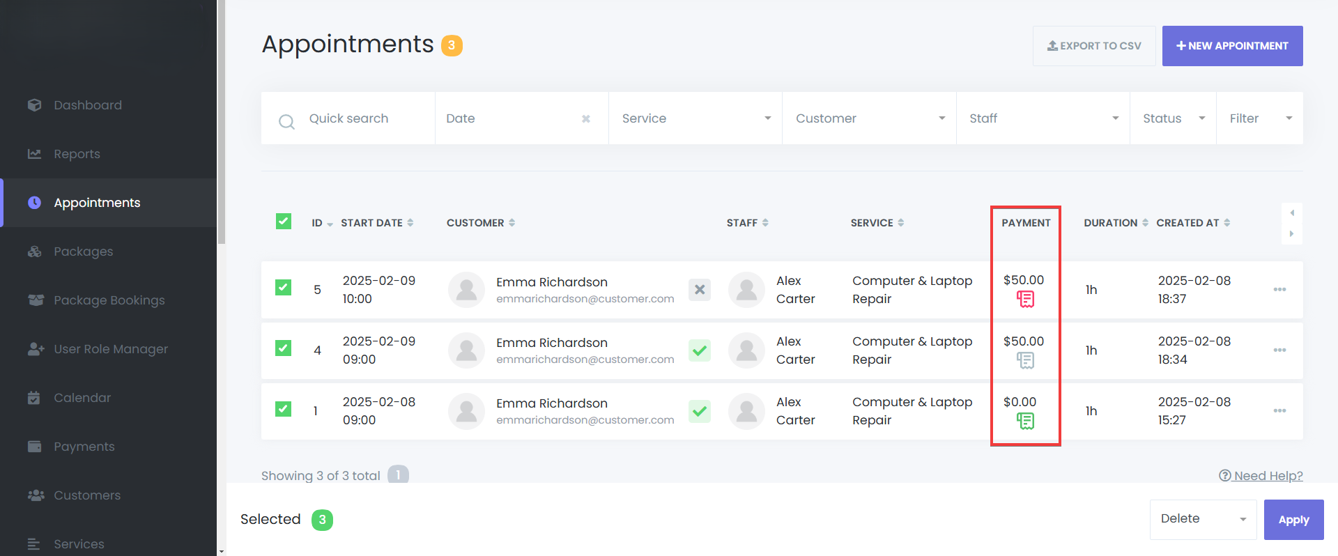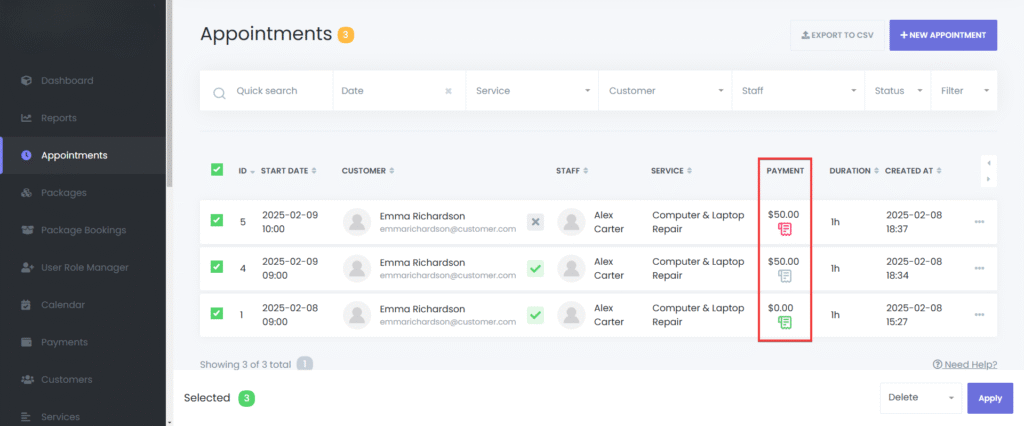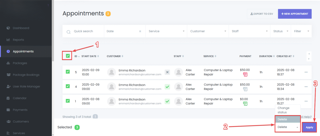 Bulk Deletion – Select multiple appointments and click the Delete button.