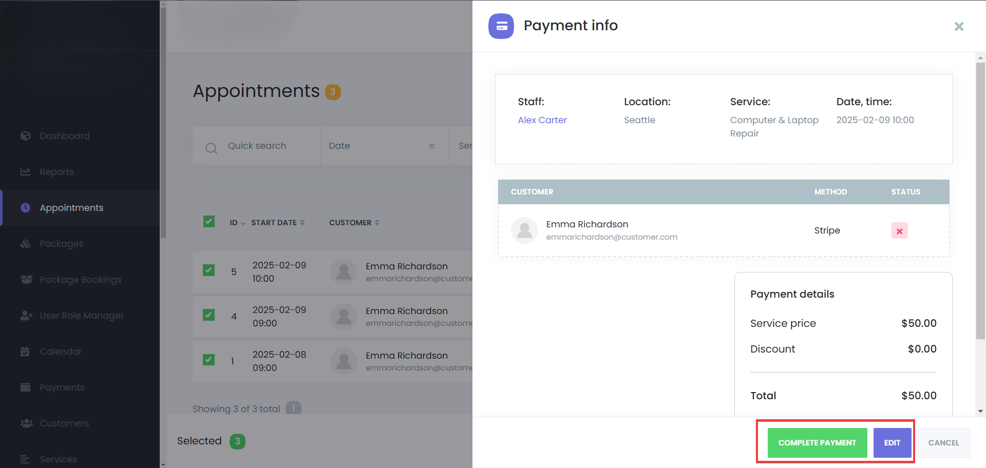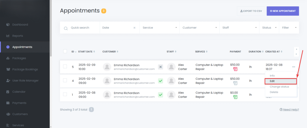 Select “Edit” – Modify details such as service, staff, or time.