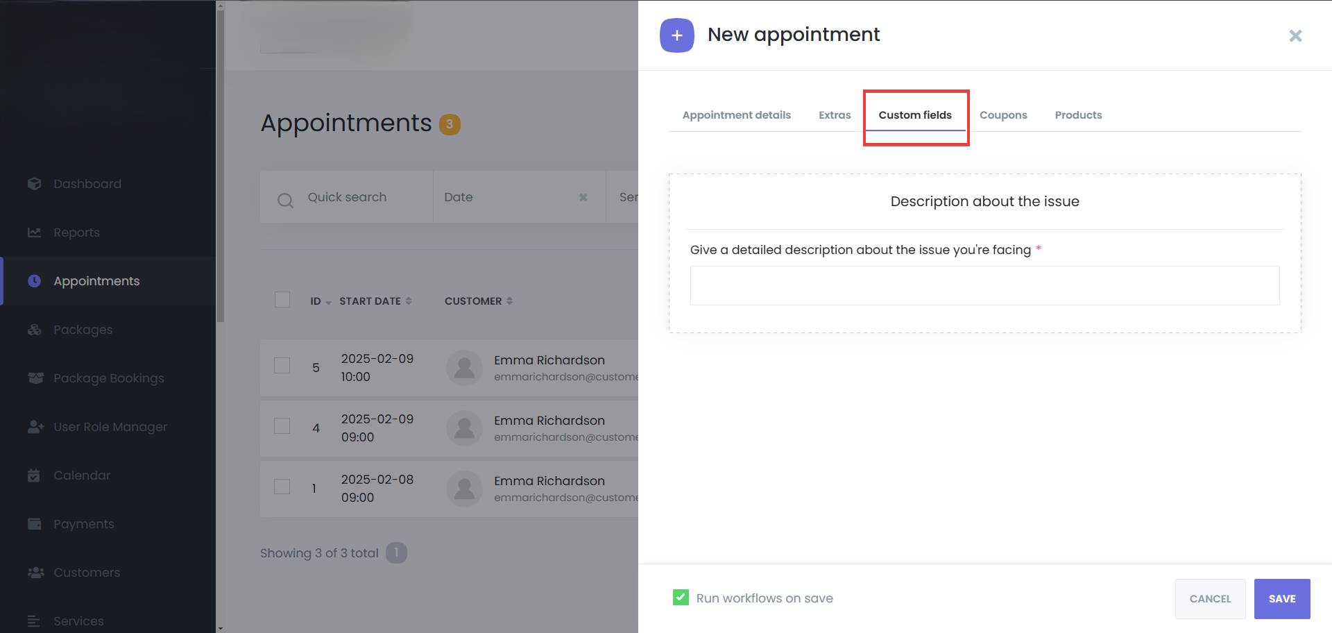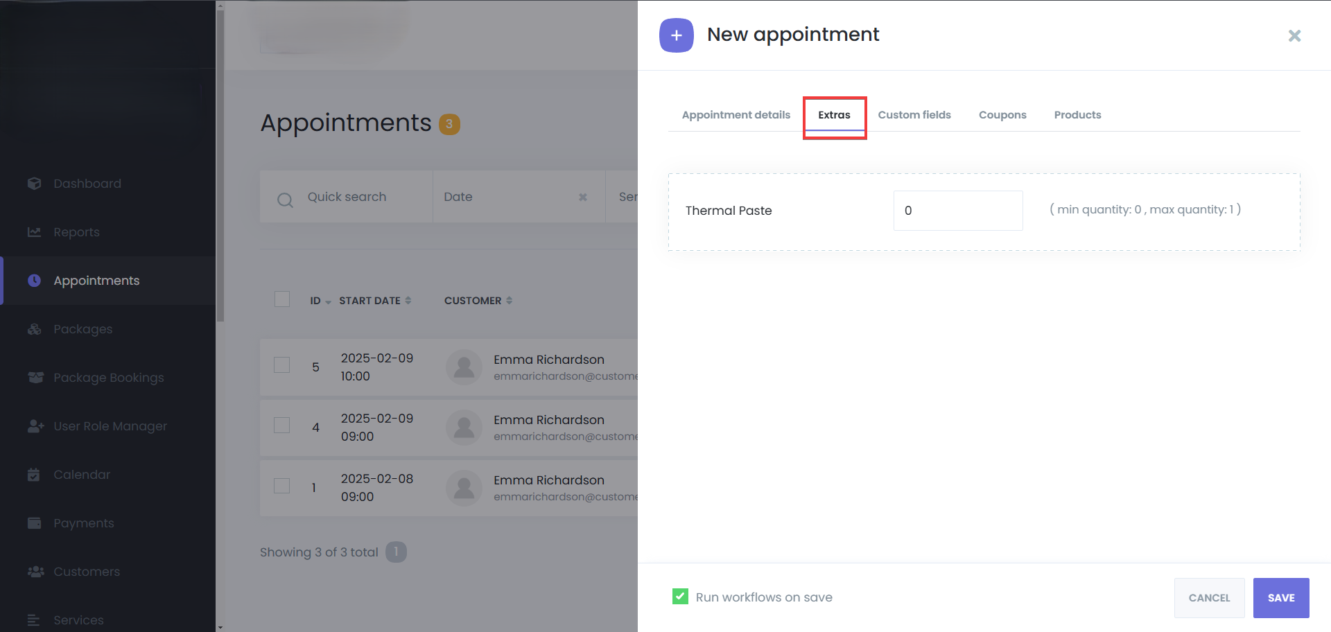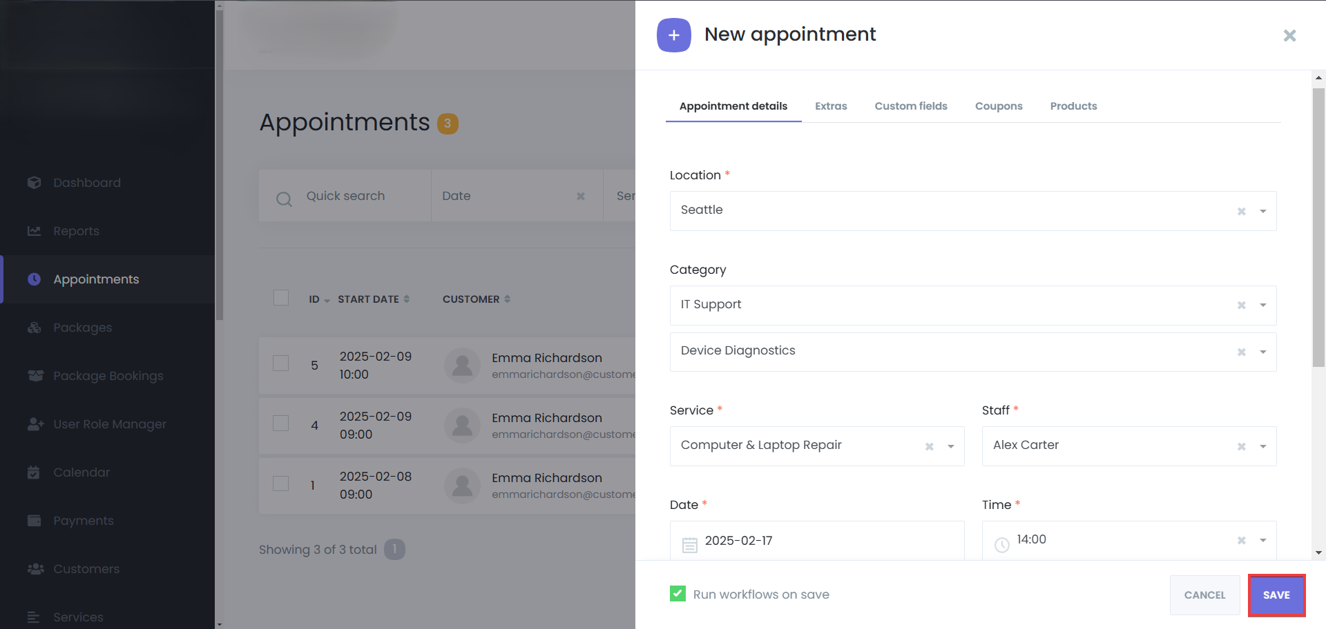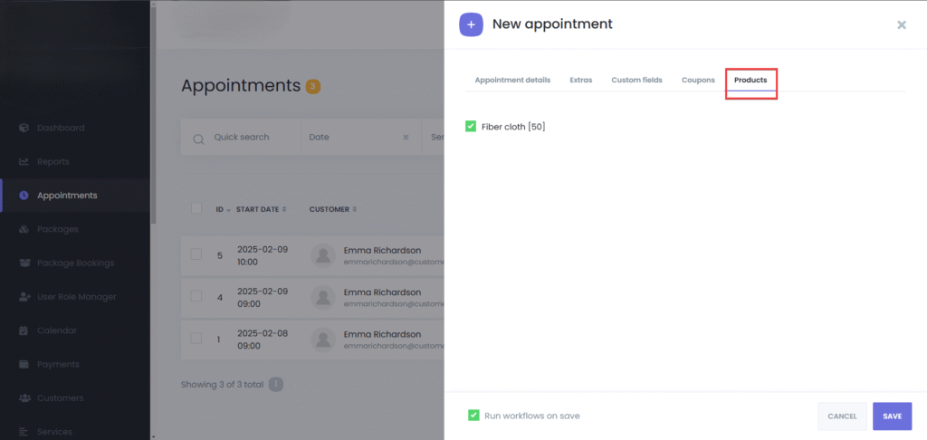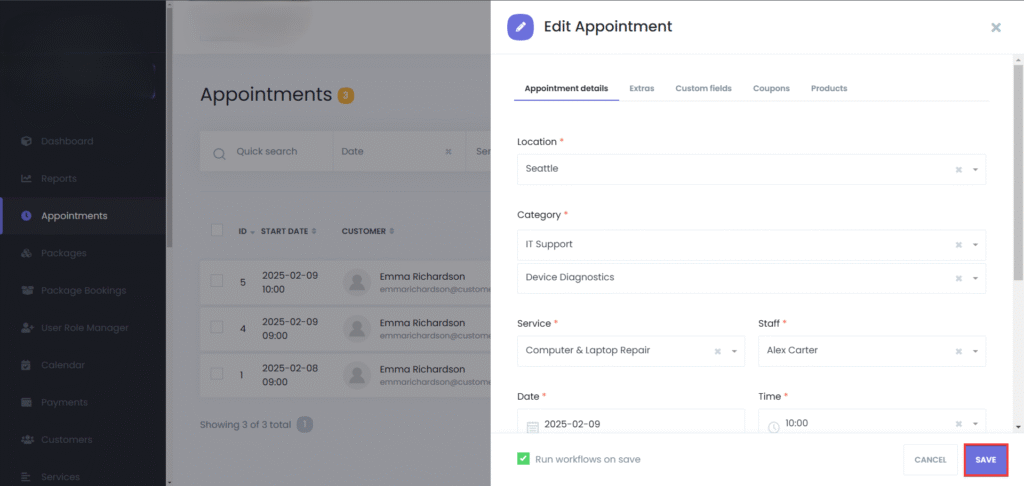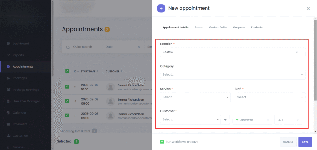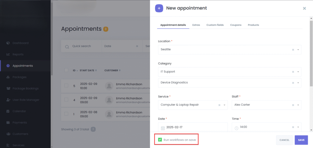 Activate Run workflows on save to send booking confirmations, or start any other workflow, based on your configuration.