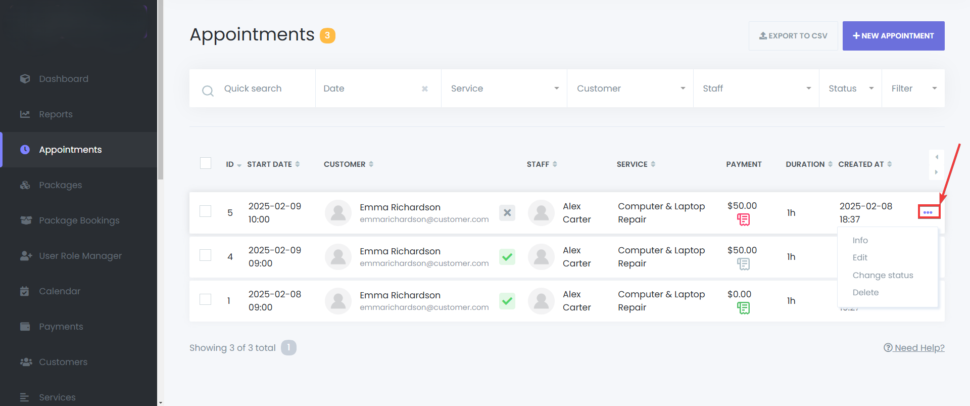 Click on the Options Icon – Open the menu next to the appointment.