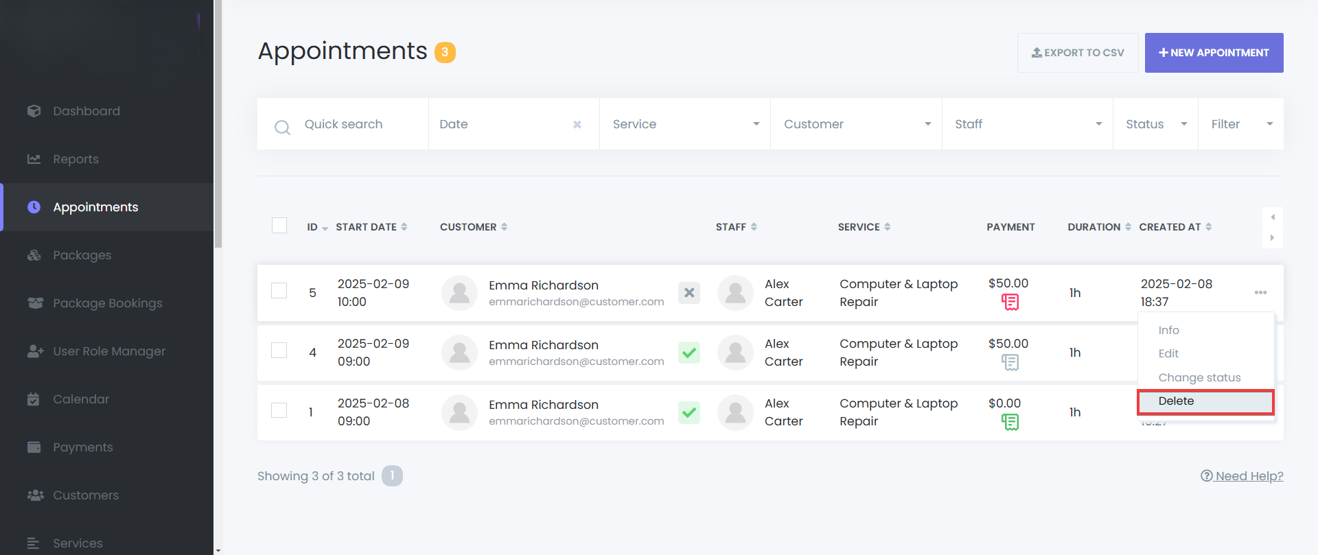 - Single Deletion – Open the menu for an appointment and select Delete.
